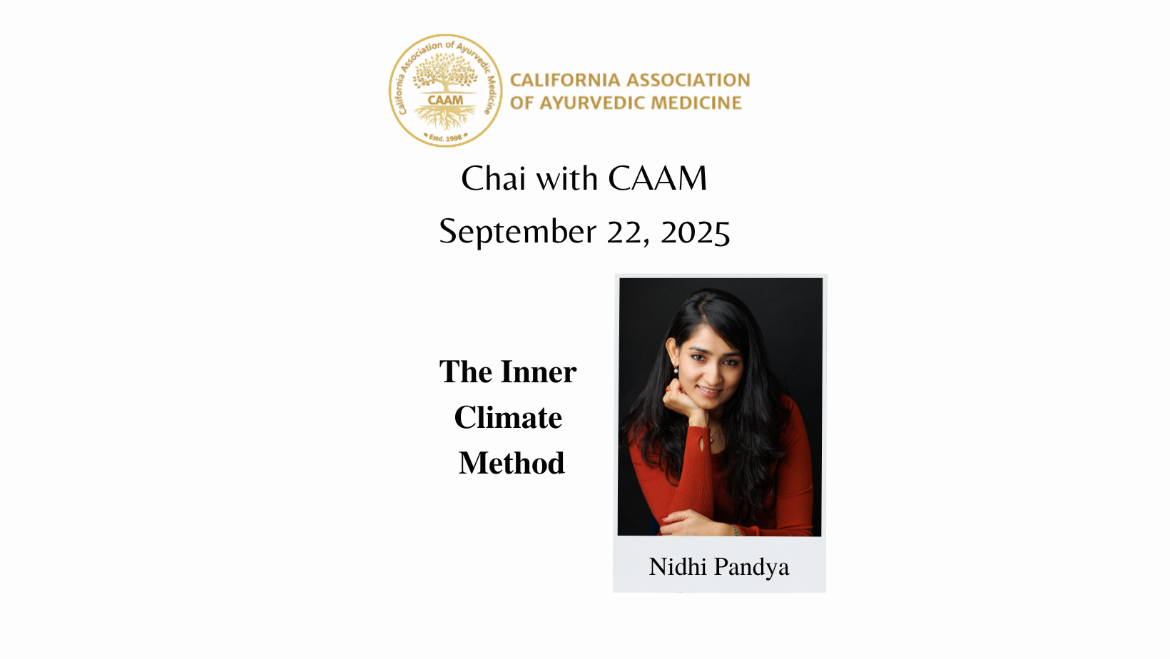 This month’s Chai with CAAM session features guest speaker Nidhi Pandya introduces The Inner Climate Method—a practical approach to balancing your body’s internal environment through Ayurvedic wisdom. Learn to align your doshas and take control of your inner climate.