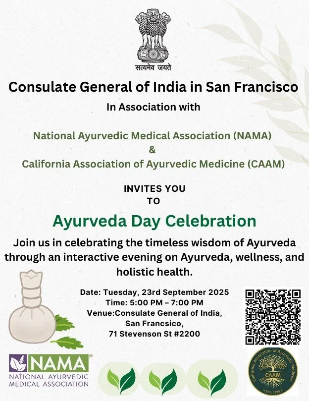 The Consulate General of India, San Francisco - in association with CAAM and NAMA - warmly invites you to an evening honoring the timeless wisdom of Ayurveda.